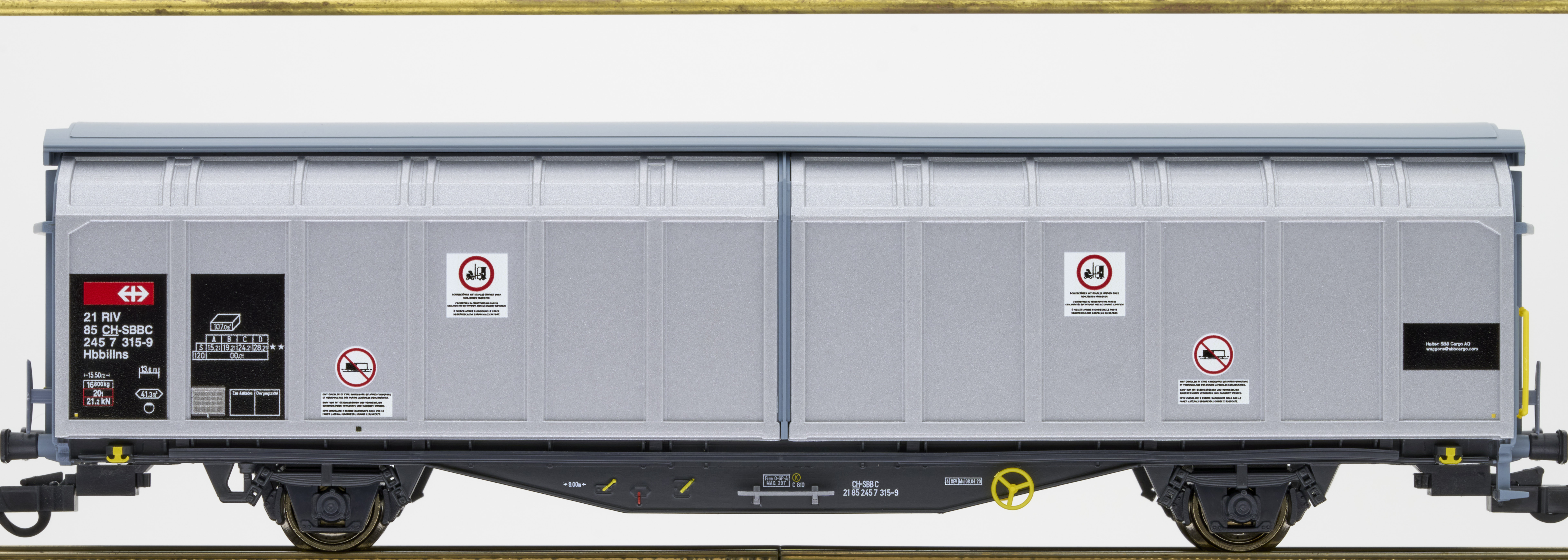 | Beschreibung: | Schiebewandwagen | | Bauart / Gattungsbezeichnung: | Hbbillns | | Bauartnummer: | - | | UIC-Nummer: | 21 85 245 7 315-9 | | Ländercode: | 85 - Schweiz | | Ländercode alphabetisch: | CH | | Haltercode: | SBBC | | Halter: | SBBC - Schweizerische Bundesbahnen SBB Cargo AG | | Bahngesellschaft: | Schweizerische Bundesbahnen SBB Cargo AG |