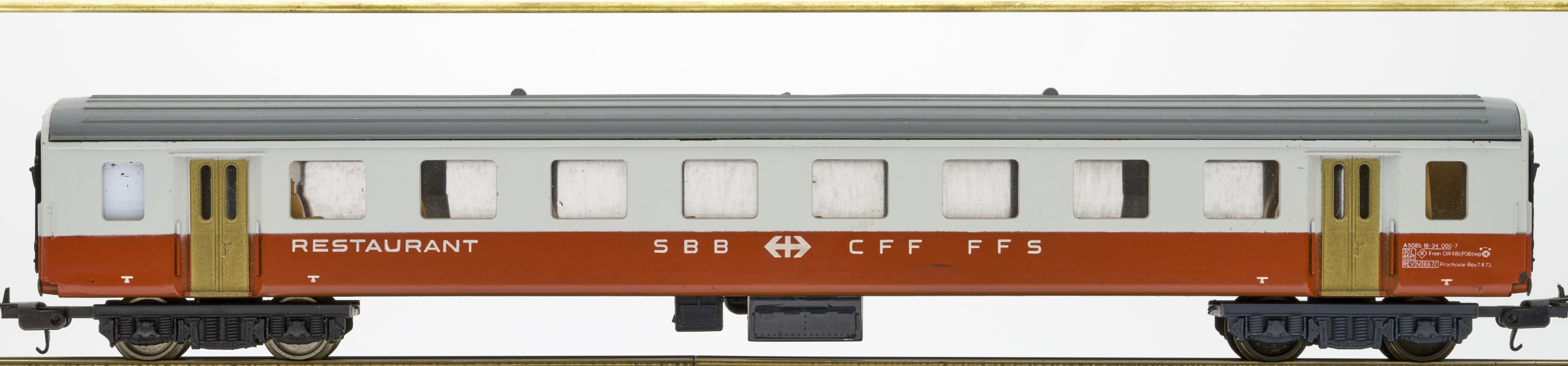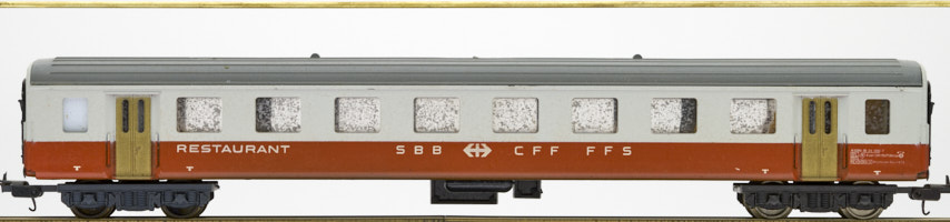 | Beschreibung: | "Swissexpress" Restaurantwagen | | Bauart / Gattungsbezeichnung: | A | | Bauartnummer: | - | | UIC-Nummer: | 50 85 18-34 000-7 | | Ländercode: | 85 - Schweiz | | Ländercode alphabetisch: | CH | | Haltercode: | SBB | | Halter: | SBB - Schweizerische Bundesbahnen SBB | | Bahngesellschaft: | Schweizerische Bundesbahnen SBB |